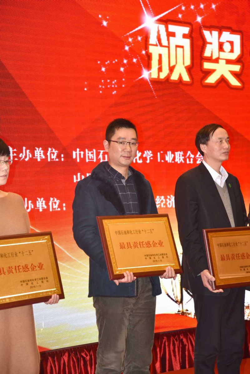 1月15日,美麗化工——風云“十二五”精英評選頒獎儀式在河北滄州舉行。浙江閏土股份有限公司榮獲“最具責任感”企業稱號。股份公司副總經理阮光棟上臺領獎。